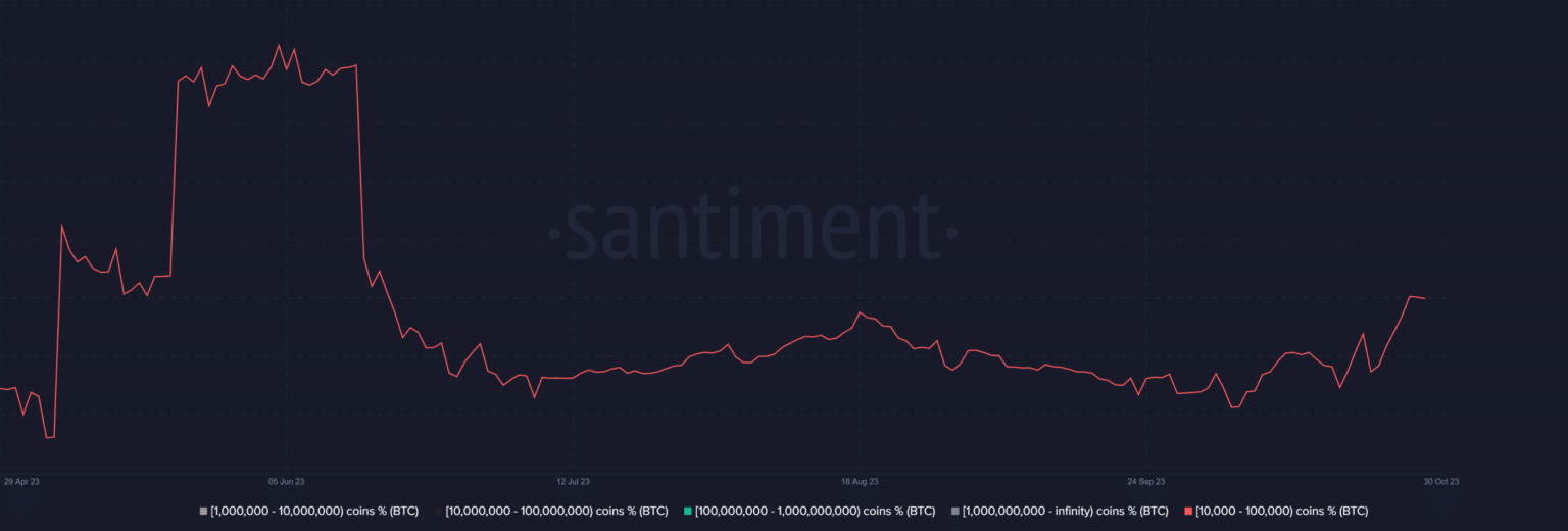 According to a Santiment chart, the current accumulation of whales is reflected in the distribution of Bitcoin supply. Specifically, within the range of 10,000 to 100,000 BTCs, there has been a noticeable increase.