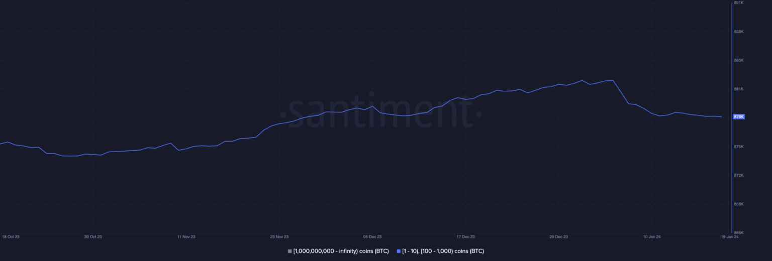 After the ETFs were approved, sentiment among these BTC holders did not improve. As of January 26, 878,000 addresses had between 1 and 1,000 coins, down 0.4% from the 882,000 addresses that had the same number of coins when the year started.