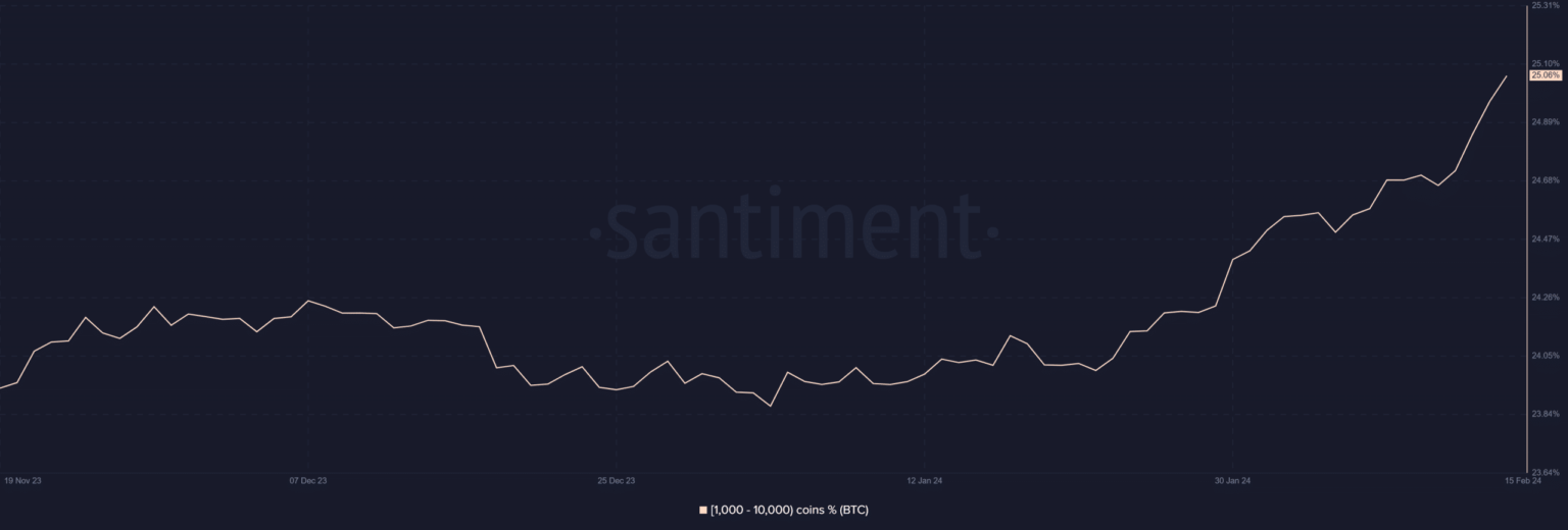 Studying the chart, it was clear that portfolios with 1,000 to 10,000 BTCs witnessed an increase in holdings, from 24% to over 25%. This upward trend started around January 22nd and has continued to this day.