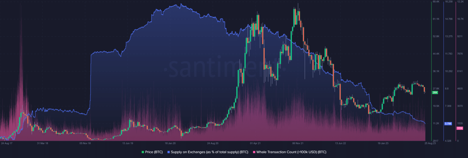 Except Bitcoin’s [BTC] price development, there is a noticeable decrease in the supply on the exchanges. Recent data indicated that this decline had reached an annual low, with large keepers (whales) showing increased interest.