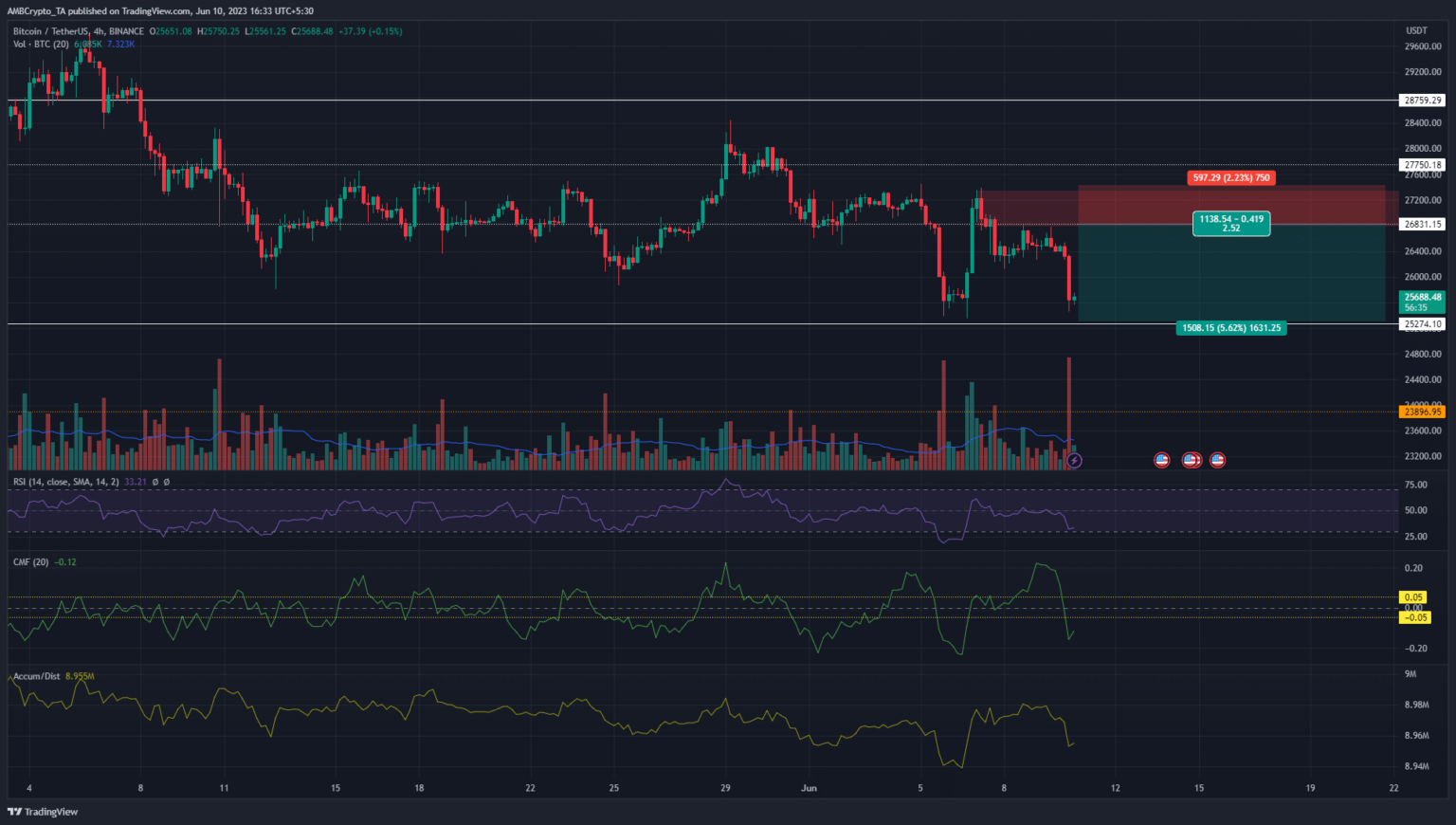 Some key levels on the chart were $25.2k, $26.8k and $27.8k. Bitcoin’s market structure was bearishly biased on the 4-hour chart and the $27.4k level represented a recent lower high. A move above this level would indicate a shift in preference to bullish patterns, although it could also be a bull trap.