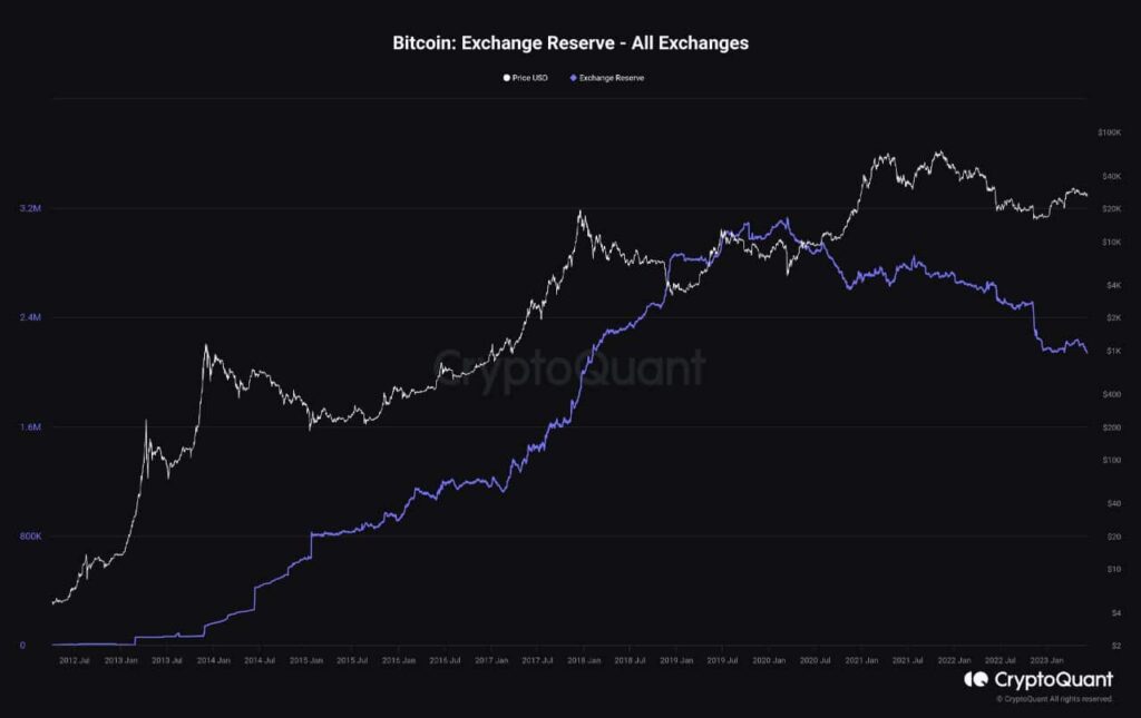 According to Maartun, a CryptoQuant analyst, Bitcoin’s declining exchange rate reserves are a positive indicator. As more people and institutions acquire and hold the king coin, the available supply on exchanges decreases, increasing the scarcity.