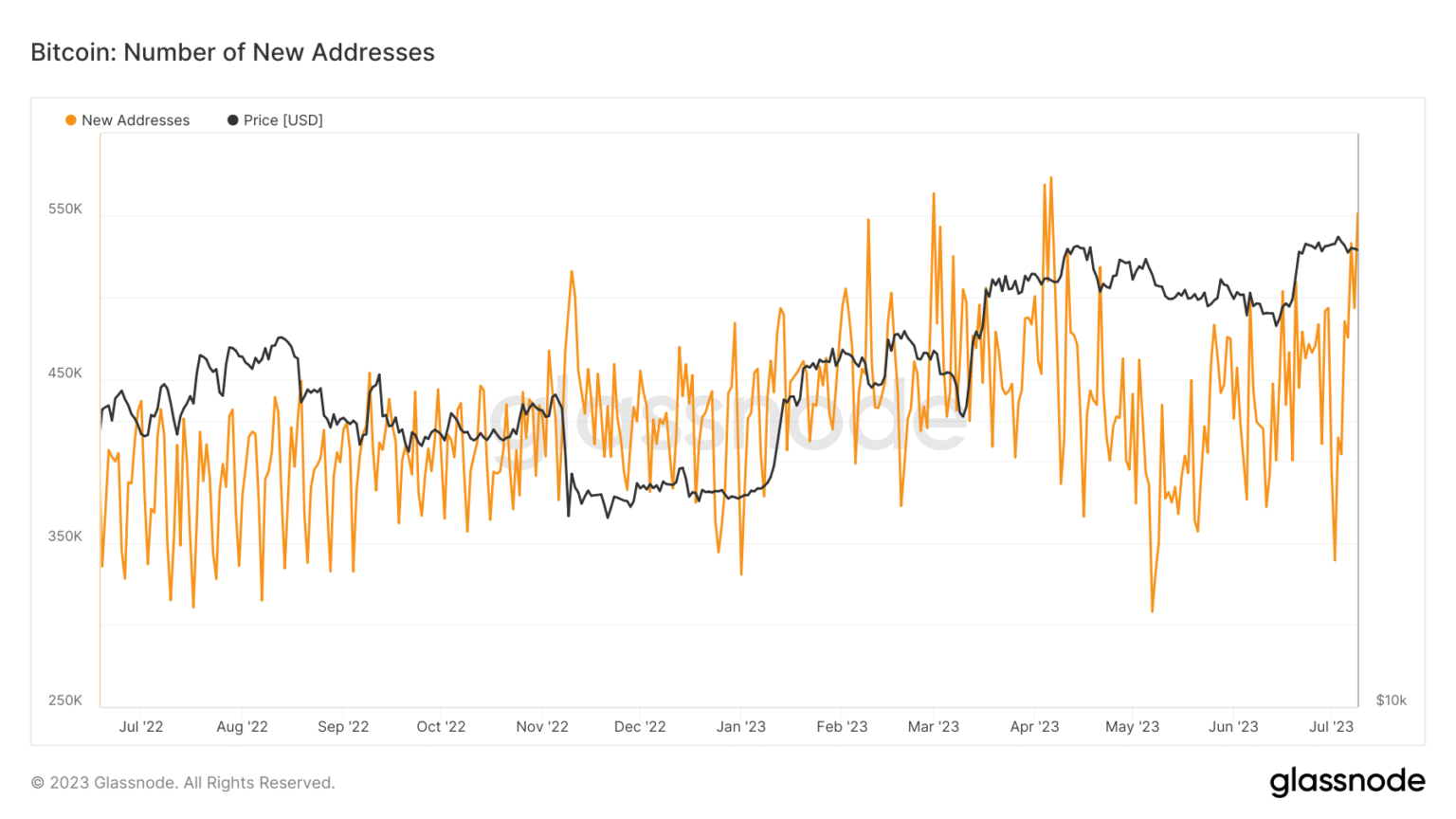 Bitcoin has been making waves lately, attracting a lot of attention and attracting a lot of users. Recent data from Glasnode revealed a remarkable increase in new addresses on the Bitcoin network. This increase was particularly significant because the last time it was observed was in April. At the time of writing, approximately 551,000 new addresses have been registered.