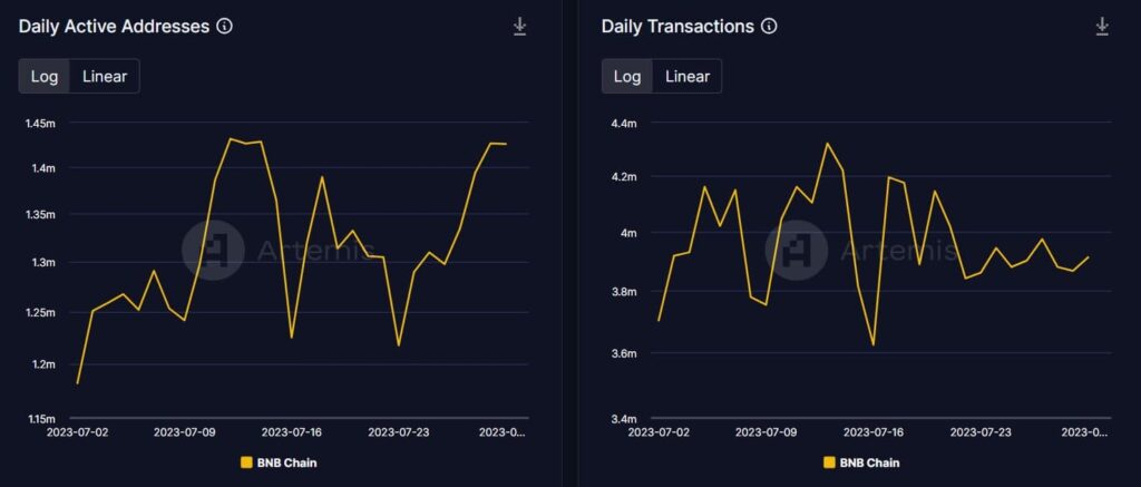 The good news was that this was not the case with BNB Chain, as its fundamentals remained strong. Artemis’ chart revealed that despite the attack, BNB’s daily active addresses registered an uptick. Its daily transactions also moved up slightly. However, the network’s TVL witnessed a slight decline on 31 July 2023.