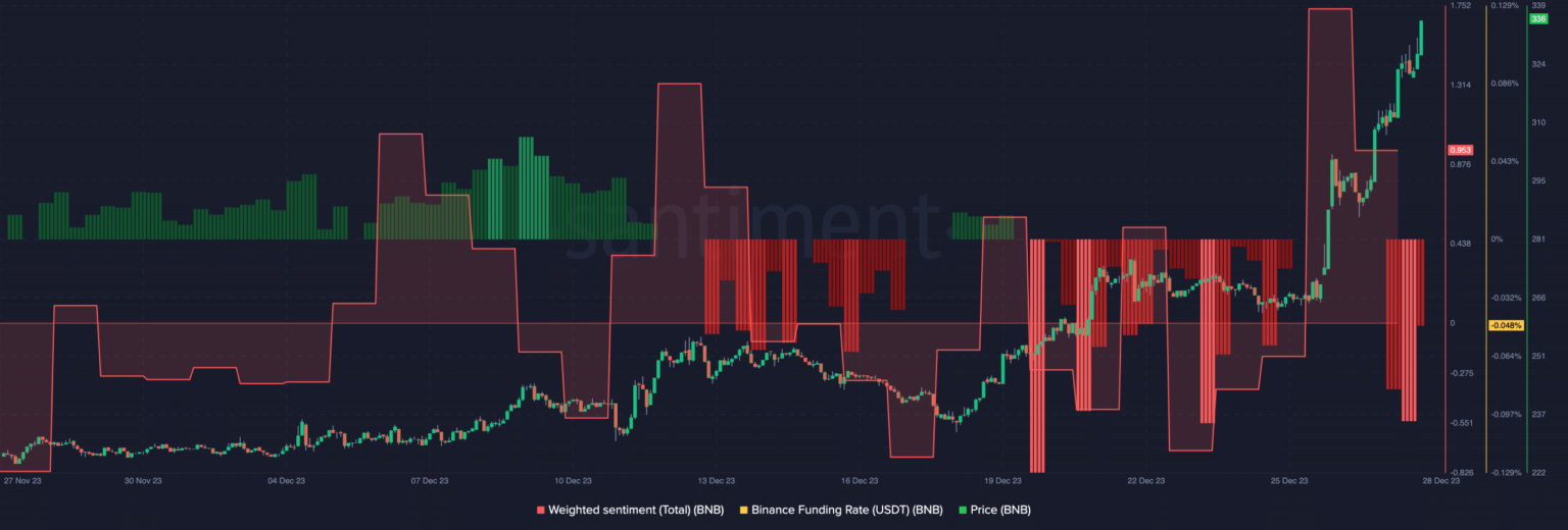 Despite the price increase, traders are bearish on the Binance Coin. According to Santiment data, BNB’s funding rate was -0.048%. Similarly, weighted sentiment also fell to 0.953.