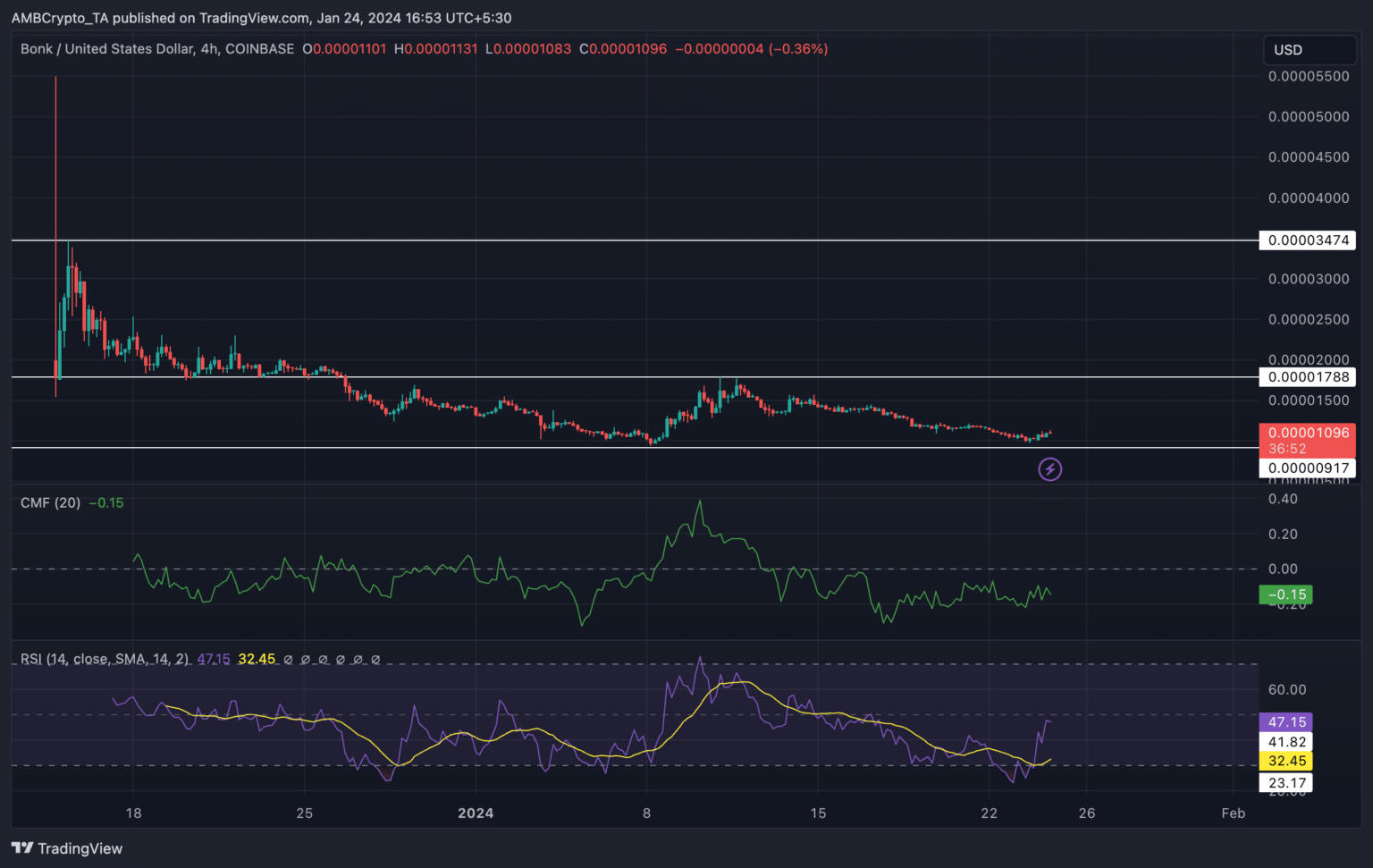 The CMF, which stood at -0.15 at the time of writing, also did not show a positive future for BONK. For the uninitiated, when the CMF is negative, it indicates there is more selling pressure in the market.