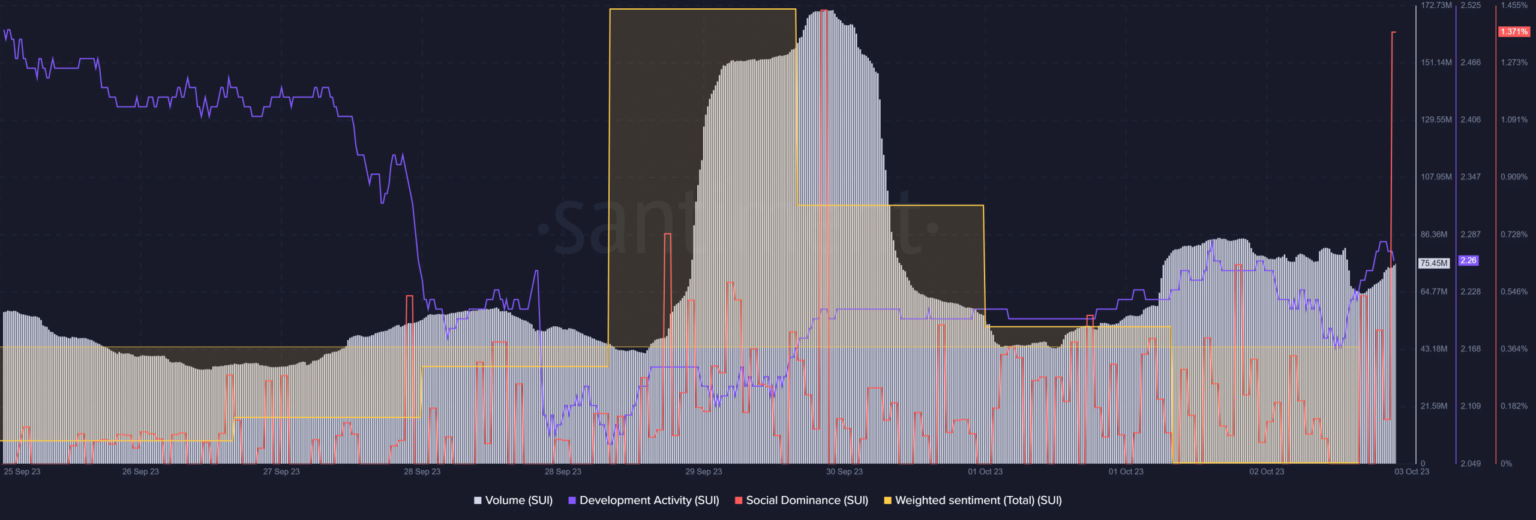For example, trading volume has fallen in recent days. Development activity around SUI also plummeted last week. Sentiment around SUI remained negative, as reflected in the decline in weighted sentiment.