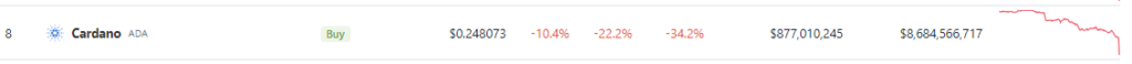 Currently valued at $0.248073 according to CoinGecko, ADA has experienced a significant drop of 22.2% in the past 24 hours, exacerbating the downtrend. Over the past seven days, the cryptocurrency has taken a staggering downturn, dropping 34.2%.