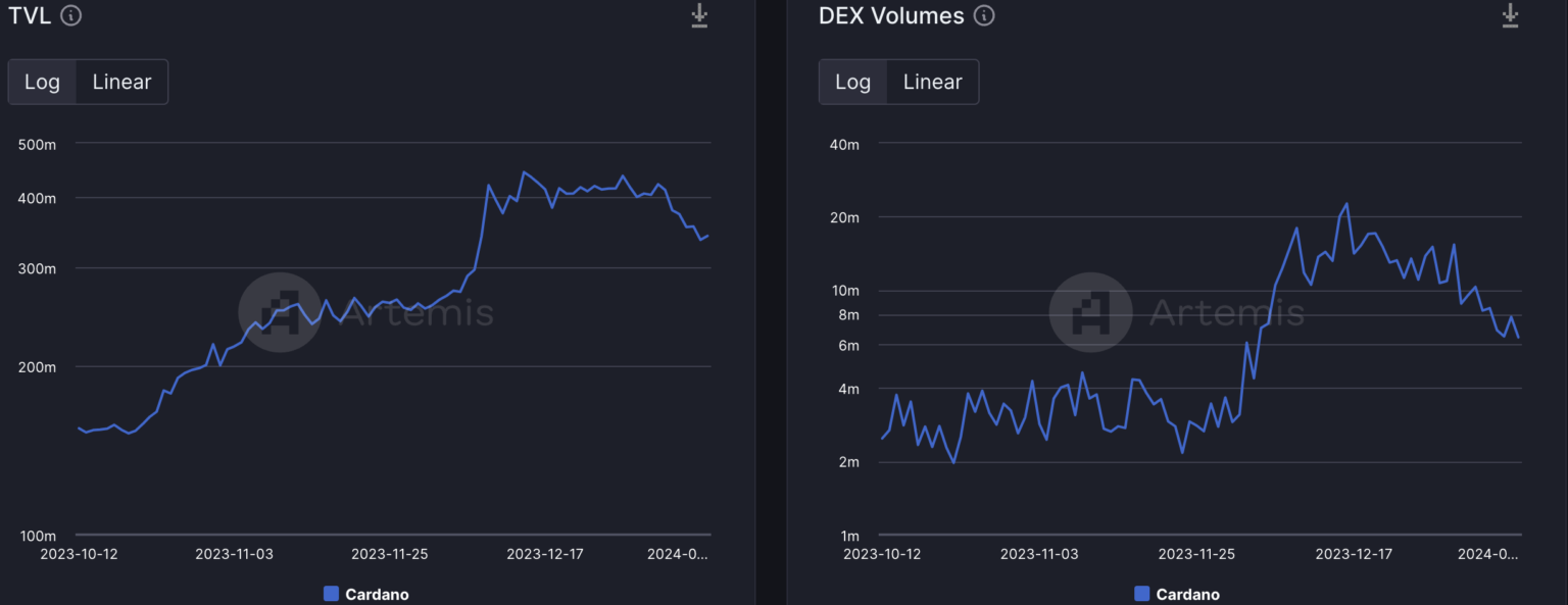 Cardano also faced setbacks in the decentralized finance (DeFi) space, with declines in Total Value Locked (TVL) and Decentralized Exchange (DEX) volumes.