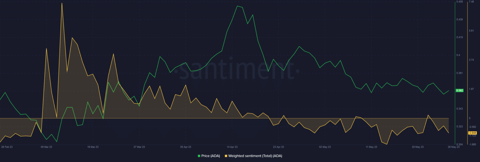 ADA’s price movement reflected the rise in network traffic. The coin posted a gain of 2.61% over the past 24 hours and was trading at $0.366 at the time of writing, according to Santiment. However, market sentiment has yet to recover after a sharp decline from the mid-April highs, as weighted sentiment was still in the negative zone.