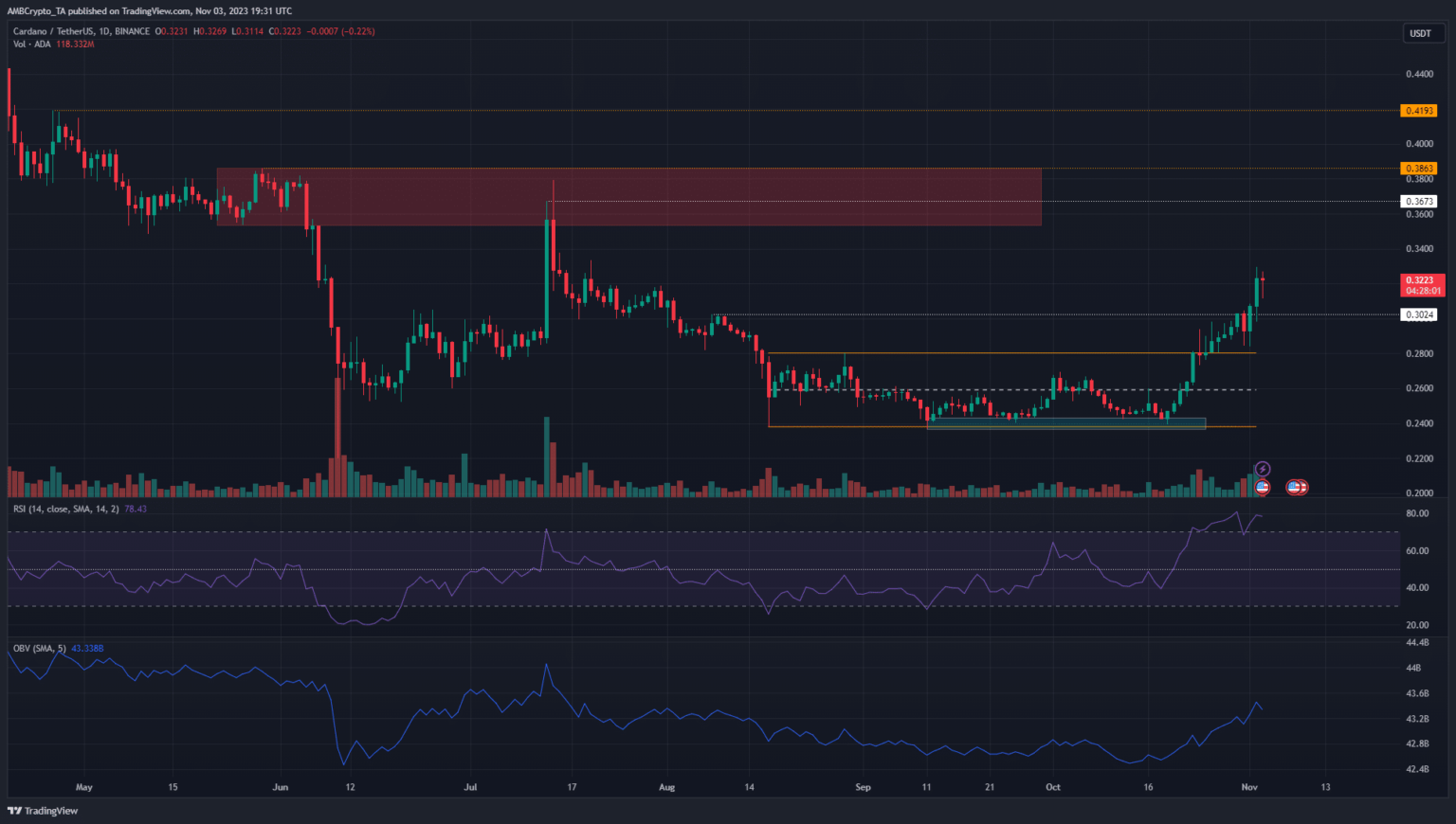 The spot CVD also jumped higher in November to signal increased demand for ADA in the market. Therefore, the bias in the lower time frame was bullish and a move towards $0.38 was feasible.