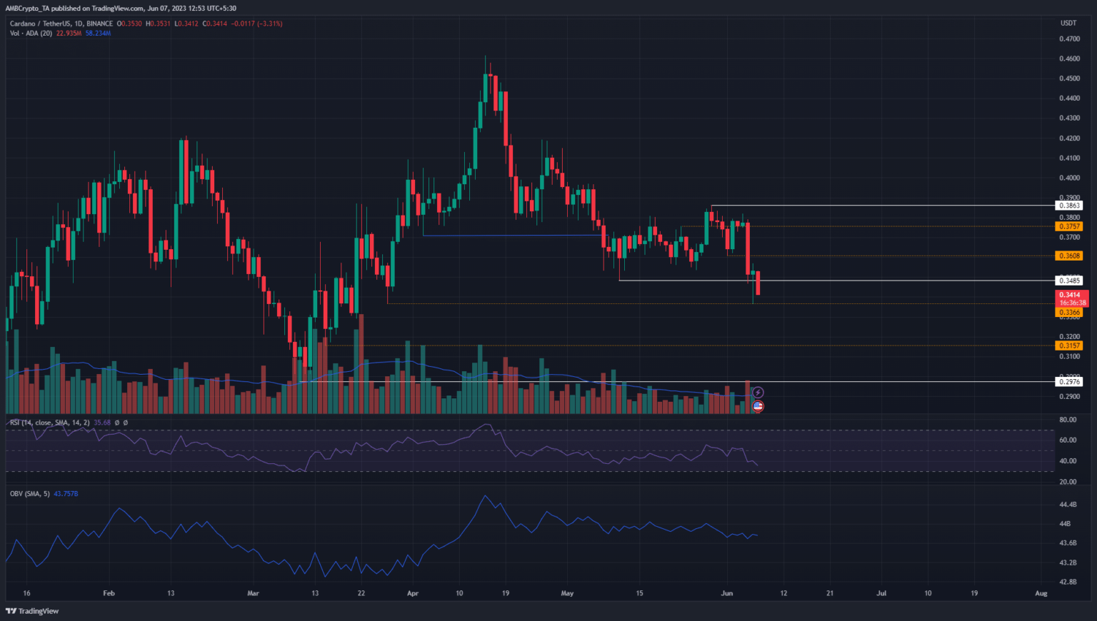 Other shorter-term support levels were highlighted in orange based on the 4-hour chart. For example, the $0.3366 was almost perfectly respected on June 6 before jumping to $0.357. Therefore, the next levels for ADA traders to watch out for are $0.3366 and $0.3157.