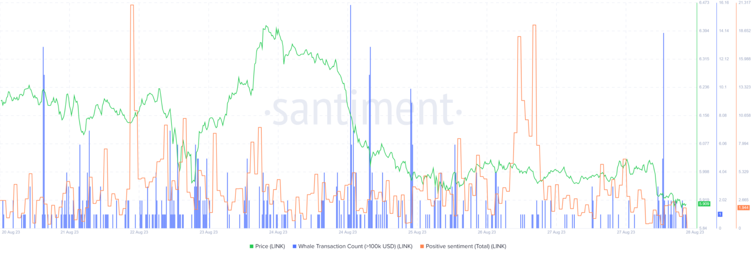 This was revealed by LINKs exchange grid current, as net deposits to the exchanges were high compared to the seven-day average. Nevertheless, Chainlink’s positive sentiment spiked a few times, reflecting investor confidence. Whale activity around LINK also remained relatively high over the past week.