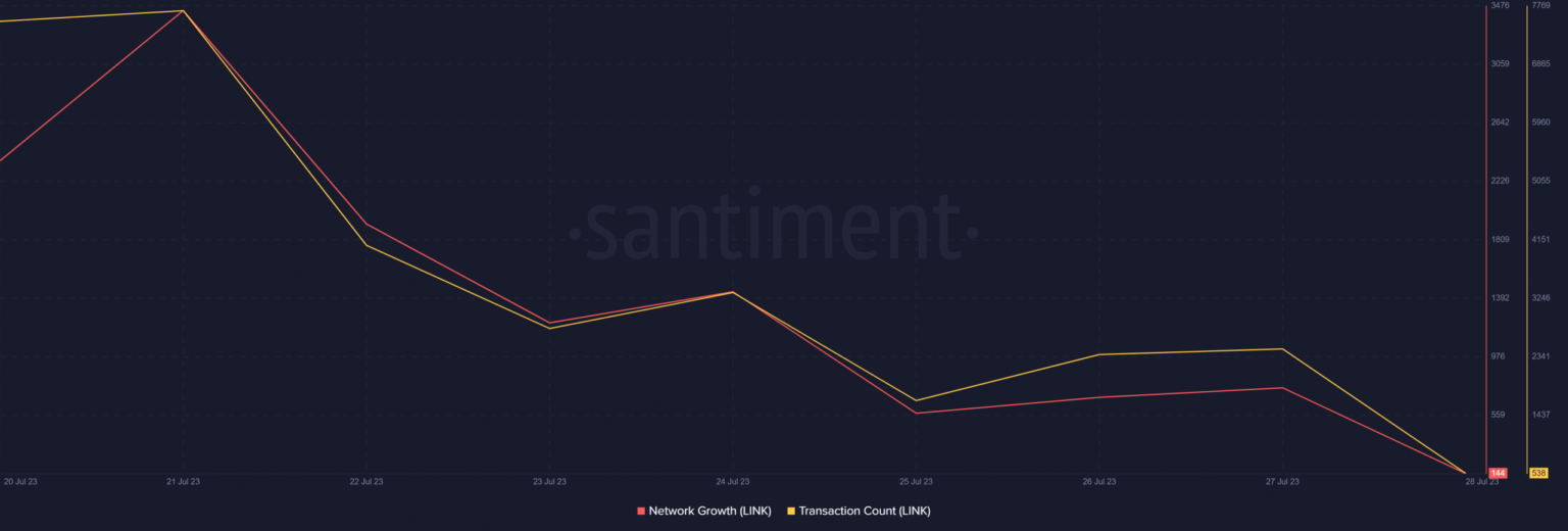 However, the increase in accumulation was not enough for LINK to maintain its uptrend, as its daily chart again turned red. Additionally, the token’s transaction count and network growth have also plummeted over the last few days.