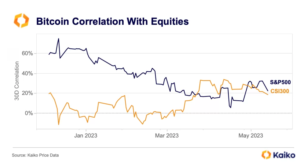 The correlation between BTC and Chinese stocks (CSI 300) strengthened significantly in 2023. This was in stark contrast to the King Coin’s declining correlation to US equities. The US banking crisis in March led investors to put their money in the crypto market. This ultimately played a major role in decoupling BTC from traditional finance.