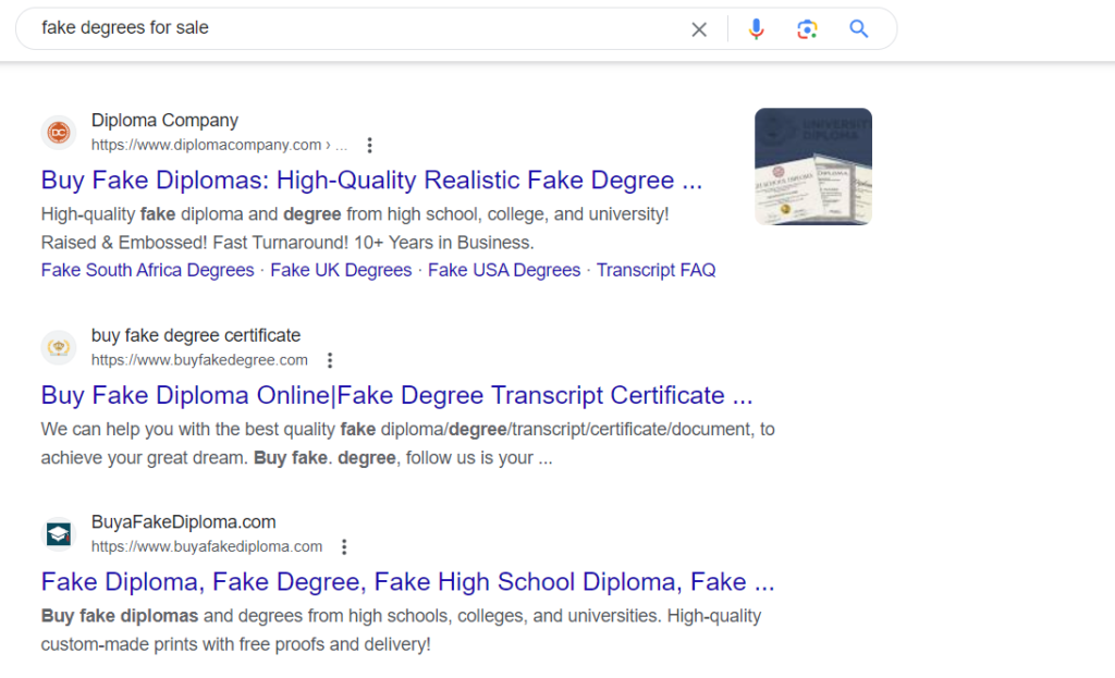 A simple search shows several sites that offer fake diplomas. Source: Google