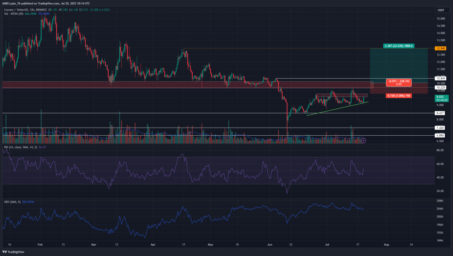 Cosmos [ATOM] bulls managed to defend the $9 support level over the past few days. While the sellers didn’t have much luck pushing prices below $9, the bulls also failed to seize control of the $10.2 resistance.