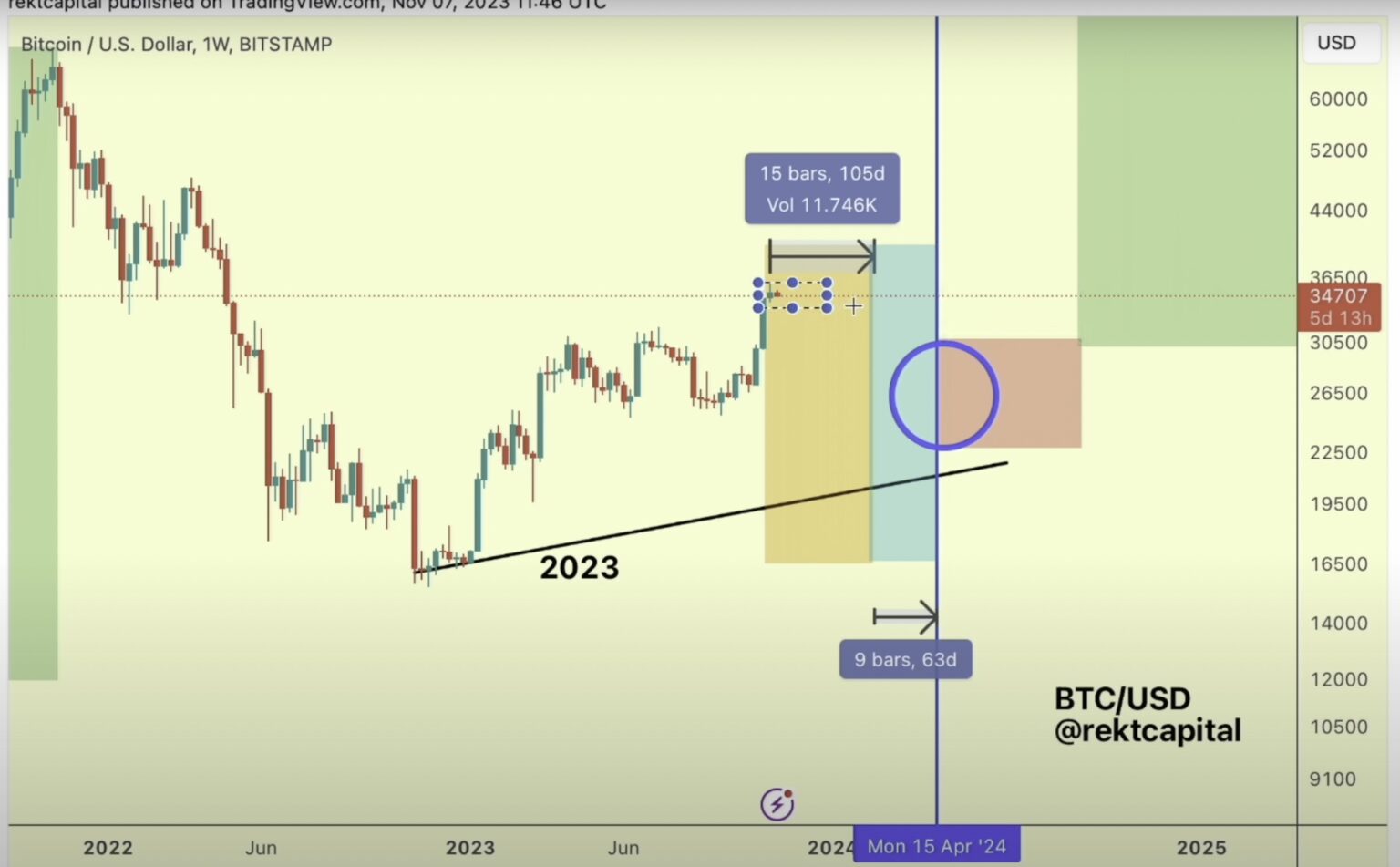 This is where Bitcoin consolidated for a significant amount of time in preparation for this light blue pre-halving rally to new yearly highs, and after hitting those new yearly highs, Bitcoin actually returned to the minus 40% range.