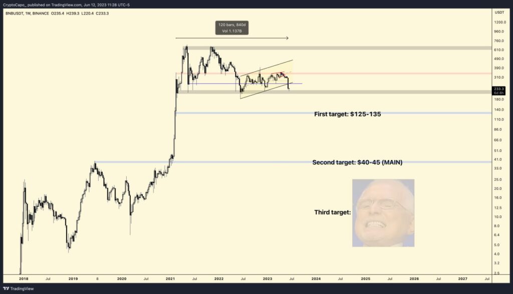Looking at Binance Coin (BNB), Capo has a main target of around $40, which is about an 83% drop from current prices.