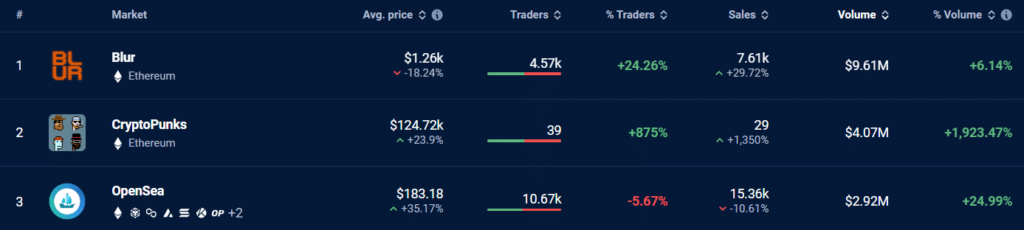 Further data from DappRadar suggests that the CryptoPunks market is seeing higher sales volume than NFT marketplace OpenSea, which has recorded a volume of $2.92 million in the last 24 hours. The CryptoPunks Collection sits alone below Blur, with a massive sales volume of $9.61 million.