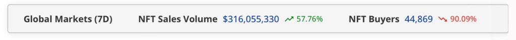 Last week’s NFT sales were approximately $316 million. Despite this increase, the number of buyers and sellers dropped significantly, by 90.09% and 88.31% respectively, according to cryptoslam.io’s seven-day data.