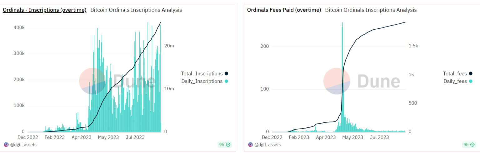 In addition to increasing transaction volume on the Bitcoin network, Ordinals also introduced transaction fees as another important aspect. At its peak, Ordinals contributed more than 200 BTC in daily fees, equivalent to approximately $7 million. However, the momentum behind these daily fees faded and even the recent increase had minimal impact.