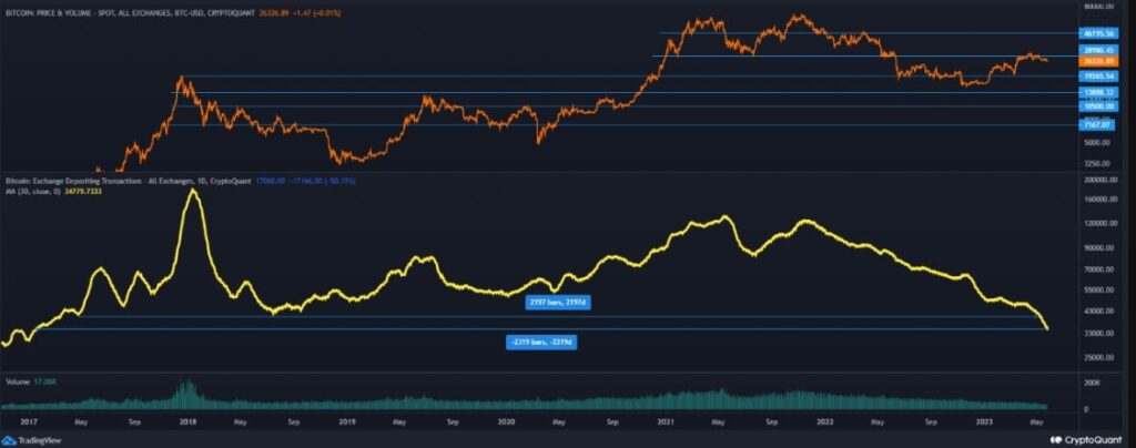Tomáš Hančar, an author and analyst at CryptoQuant, published a analysis on May 25 revealed that the number of deposit transactions broke a historic 6-year low at the beginning of this month.