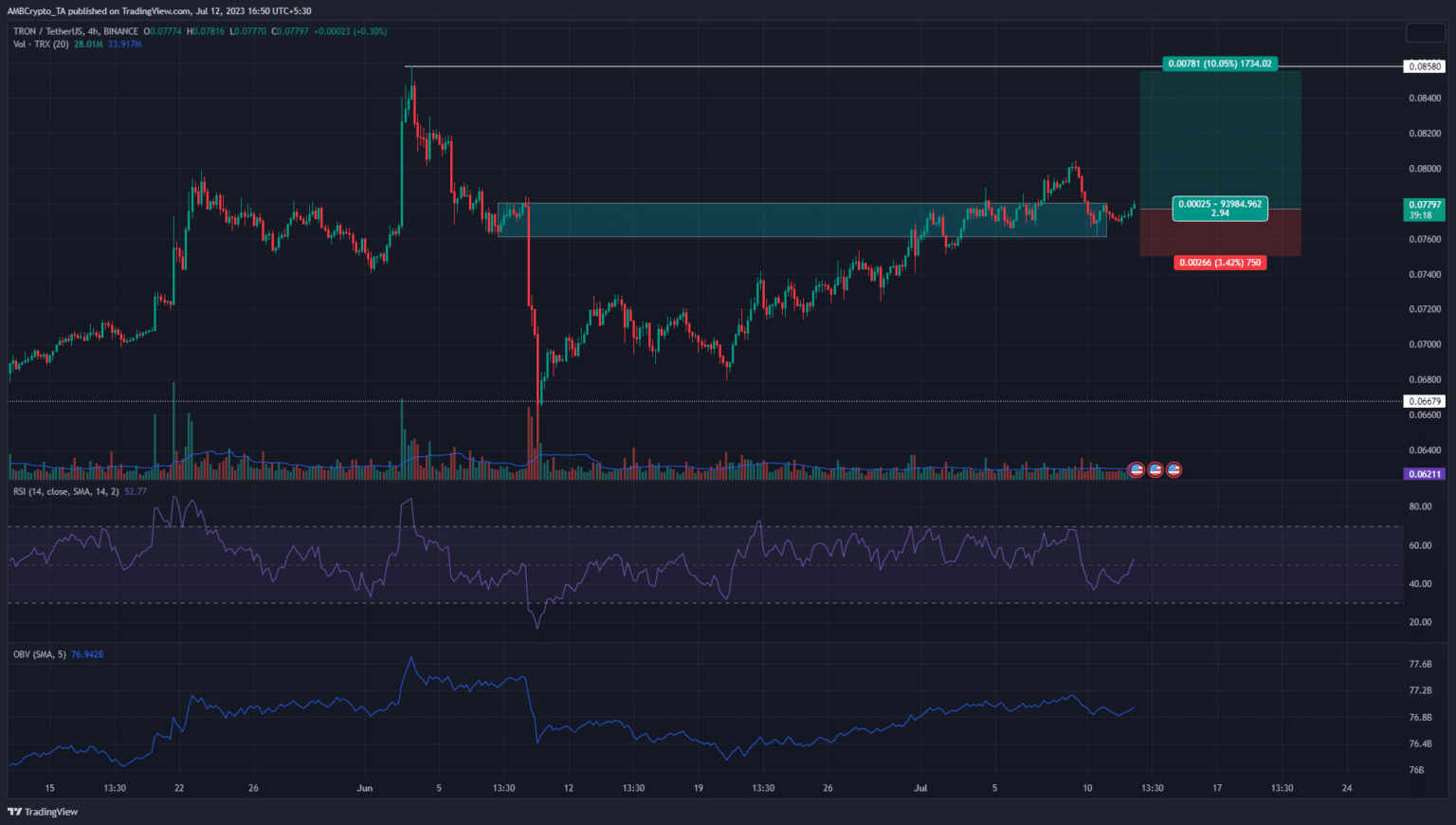 The 4-hour chart showed that the market structure was once again bullish after TRX climbed past $0.078 in the past few hours. The jump from $0.0766 to $0.0805 lasted from July 6 to July 9, but most of these gains were erased over the past two days.