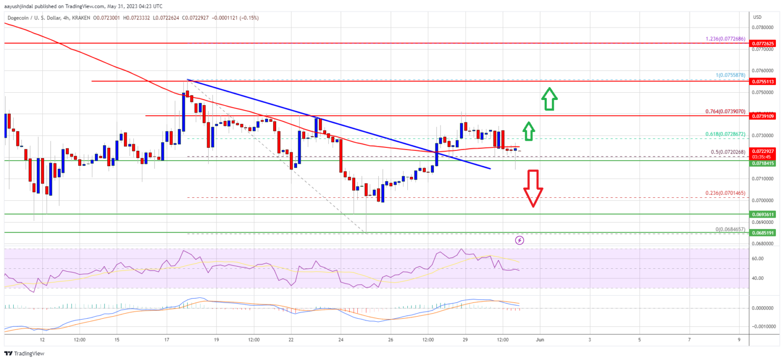 Doge is now trading below the $0.0725 zone and the 100 simple moving average (4 hours). It is holding the key support zone at $0.0718. On the upside, the price is facing resistance near the $0.0722 level. The first major resistance is near the $0.0740 level.