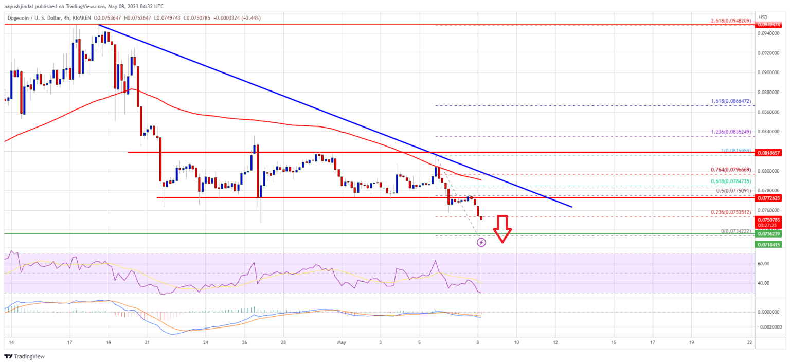After a small increase, Dogecoin price encountered resistance near $0.0820. DOGE peaked near $0.0815 and started another decline similar to Bitcoin and Ethereum.