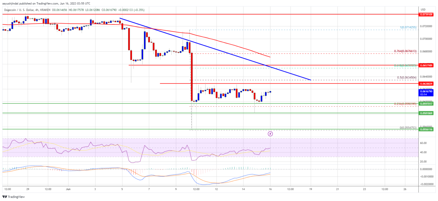 - A major bearish trendline is forming with resistance near $0.0635 on the DOGE/USD pair’s 4-hour chart (data source from Kraken).
