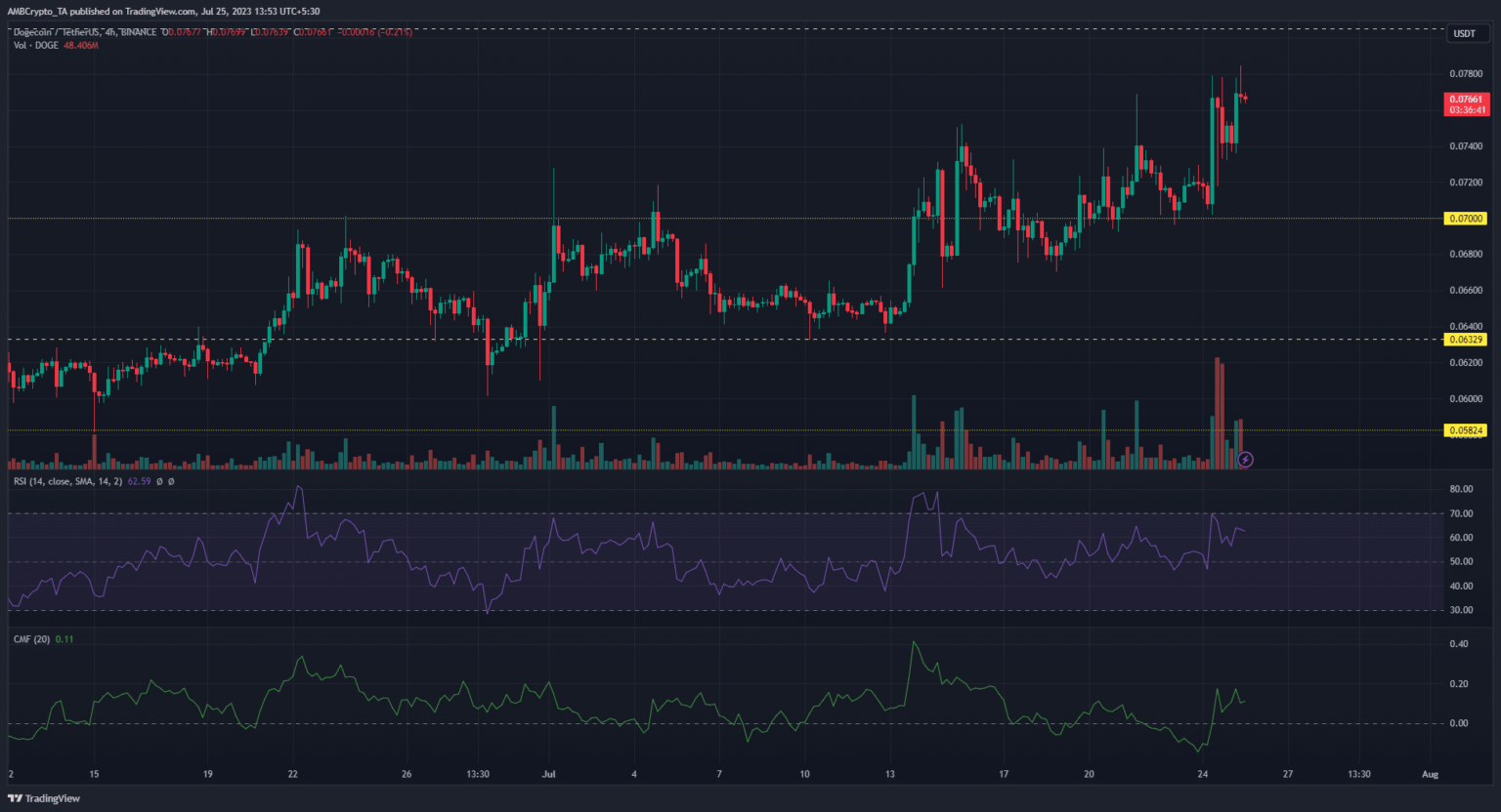 Dogecoin [DOGE] bulls rallied significantly in the past 24 hours to hit a new high in July. Building on the foundation of flipping from the $0.0700 resistance to support, bulls registered gains of 11% to move beyond the key $0.0750 price zone.