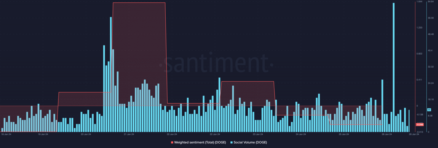 Unlike what happened earlier this week, Dogecoins [DOGE] social volume fell to the lowest level, according to Santiment data showed. By January 25, the social volume had increased to 63.80. This initial increase implied that searches for DOGE were increasing and rampant in the market.