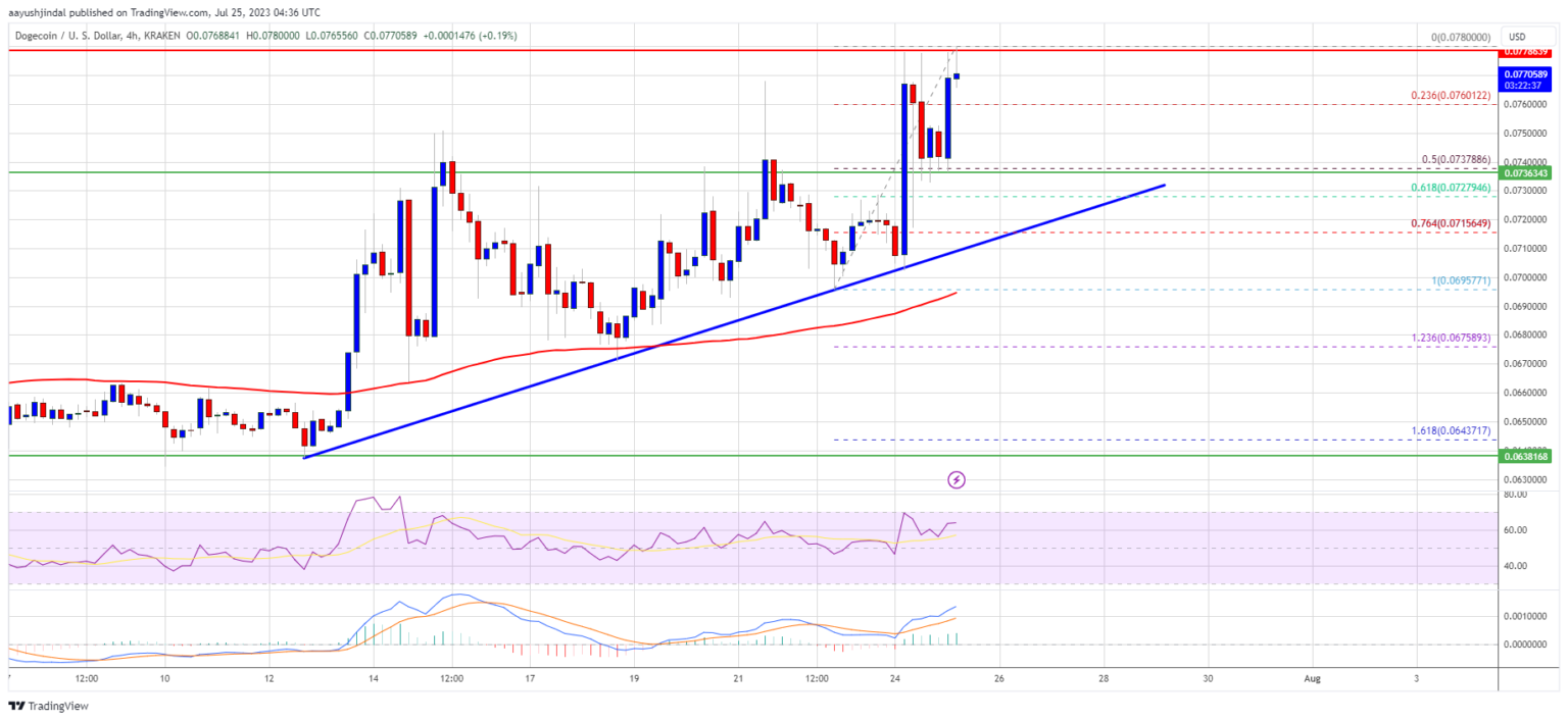 DOGE is trading well above the $0.0725 zone and the 100 simple moving average (4 hours). A major bullish trendline is also forming with support near $0.0725 on the 4-hour chart of the DOGE/USD pair. The pair is now trading above the 23.6% Fib retracement level from the recent rally from the $0.0695 swing low to the $0.0780 high.
