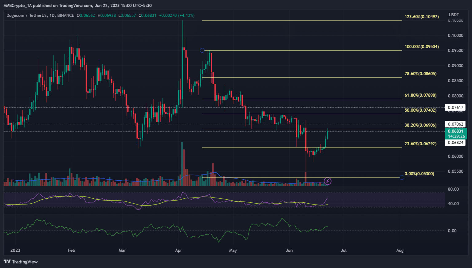 Memecoins then experienced a remarkable recovery From Bitcoin [BTC] foray into the $30k zone. Dogecoin [DOGE], a tier-1 meme coin, is up more than 9% in the past seven days, according to CoinMarketCap. It zoomed past the March low of $0.065, but bulls had to clear the 38.20% Fib level of $0.06906 to get more leverage.