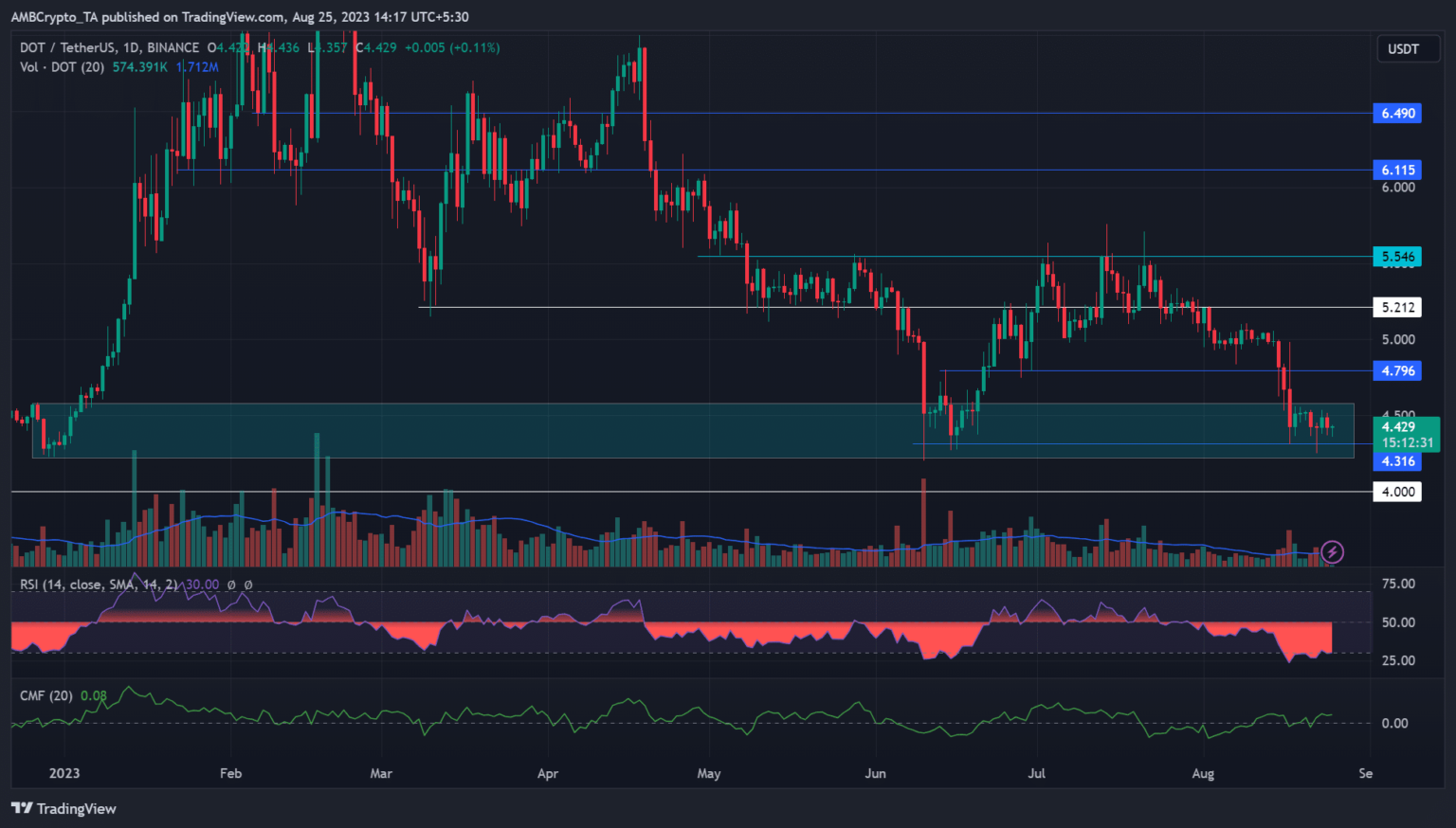 DOT was trading at $4.43 at the time of writing. The level was an extension of the range formation ($4.0 – $4.55) since Aug. 18. However, the band formation coincided with a crucial long-term support and a weekly bullish order block (OB).