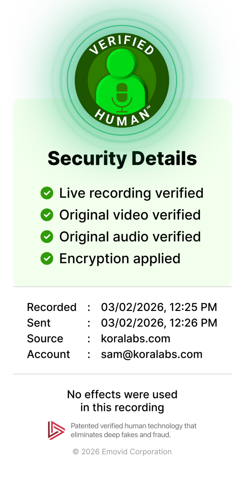 “Emovid’s patented platform verifies human origins while protecting message integrity, creating a new foundation for trusted digital communications.”