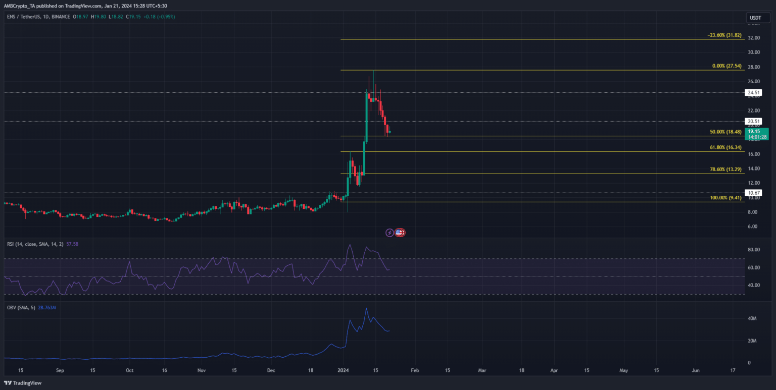 Ethereum name service [ENS] Won 191% from January 1 to 14. It rose from $9.44 to $27.54, but has since fallen to $19.15 at the time of writing. The recent dip also brought prices below $20.5.