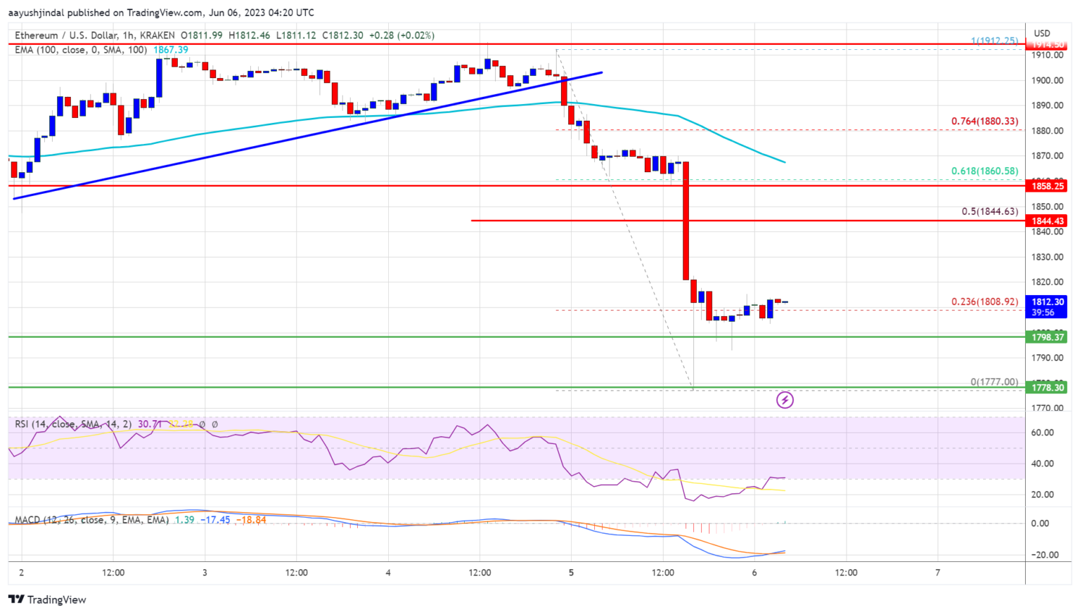 If Ethereum fails to clear the $1,840 resistance, it could drop further. The first support on the downside is near the $1,775 level.