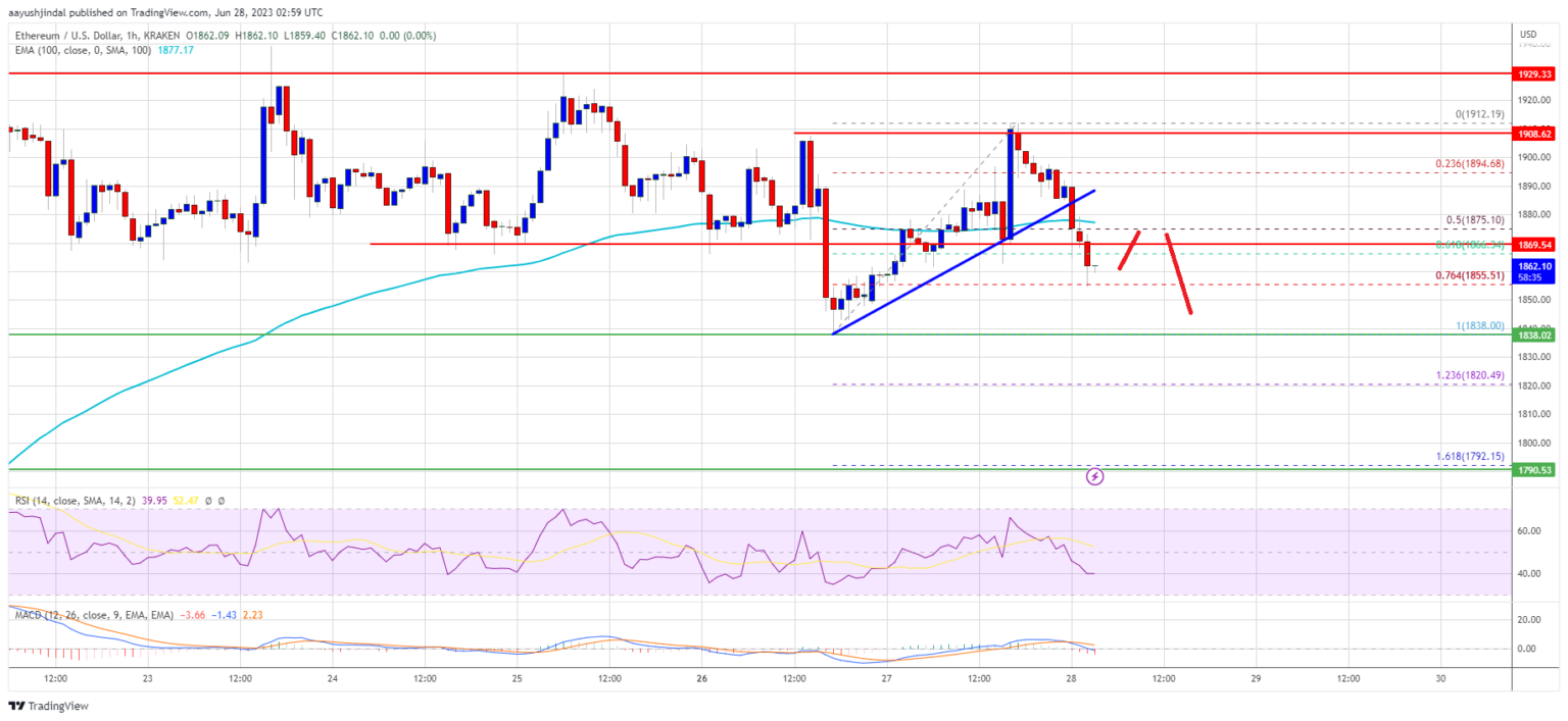 If Ethereum fails to clear the $1,900 resistance, it could fall further. The first support on the downside is near the $1,850 level.
