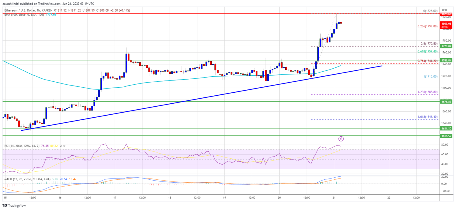 There was a break above the $1,770 resistance zone. It even peaked above $1,800. A high is formed near $1,826 and the price is now consolidating gains. It is still above the 23.6% Fib retracement level from the recent rise from the $1,715 swing low to the $1,826 high.