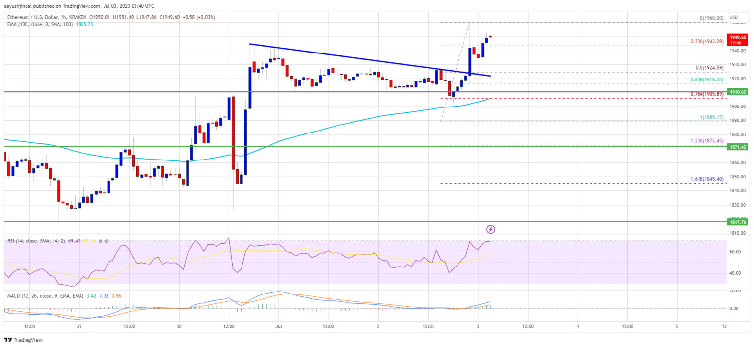 There was clear movement above the $1,920 resistance zone. In addition, there was a break above a key bearish trendline with resistance near $1,925 on the ETH/USD hourly chart. The price even traded to a new multi-day high of $1,960 and is currently consolidating gains.