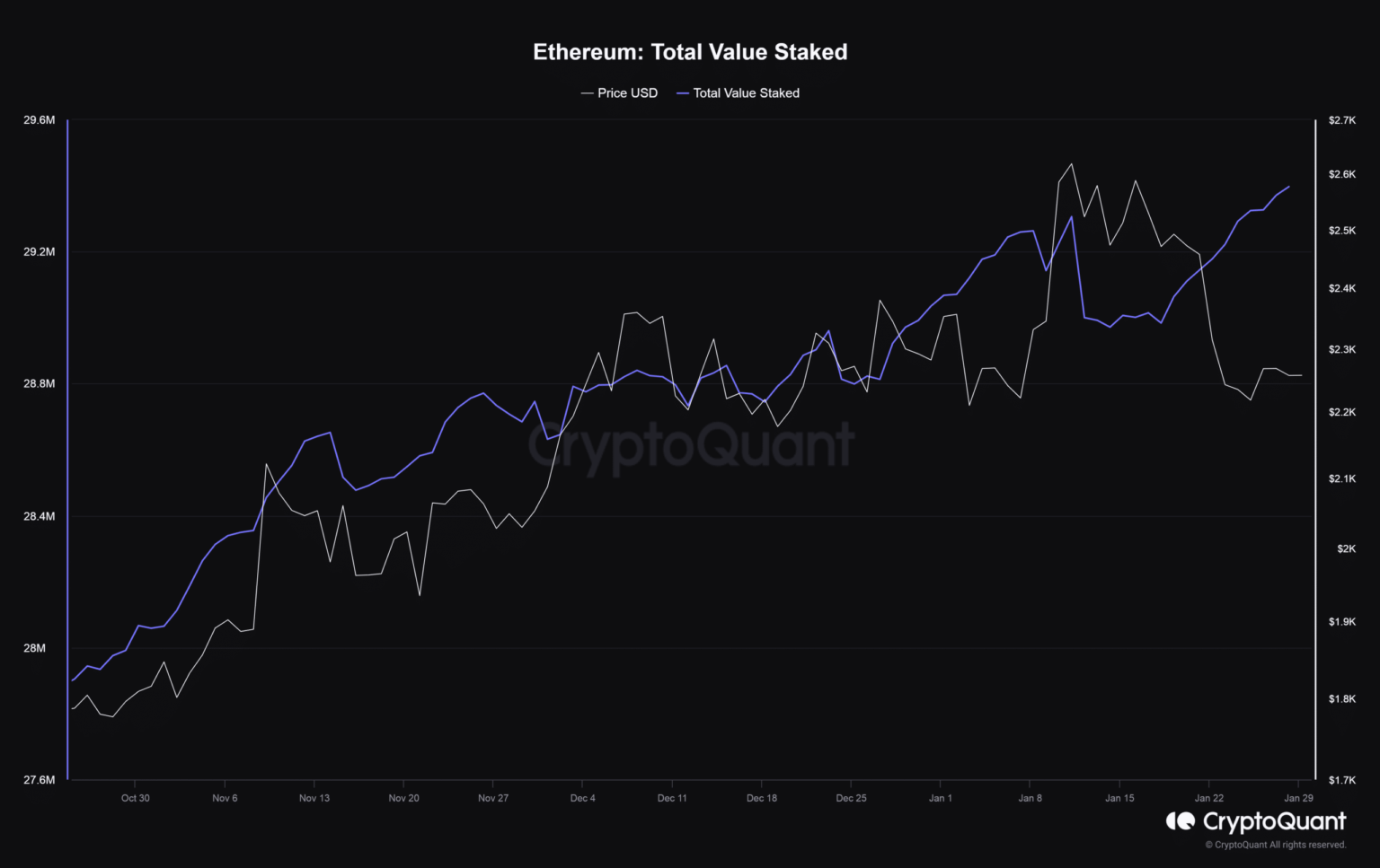 According to AMBCrypto’s analysis of CryptoQuant data, approximately 29.39 million ETH coins had been staked on the blockchain at the time of writing, representing almost a quarter of the total circulating supply.