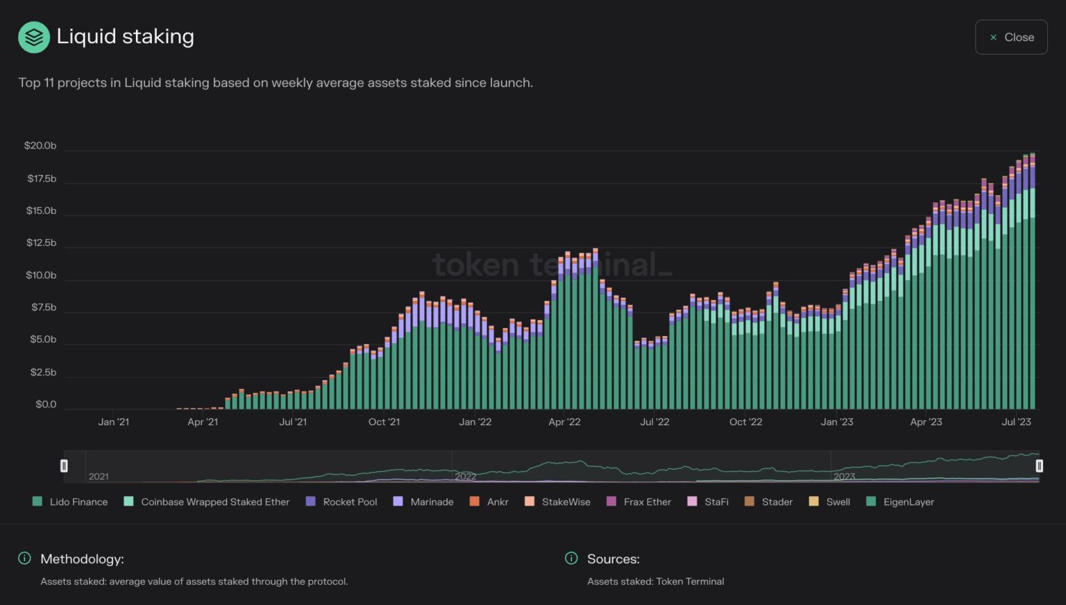 According to a Twitter user citing Token Terminal data, the total amount of ETH staked through liquid staking platforms has gradually increased since the beginning of 2023.
