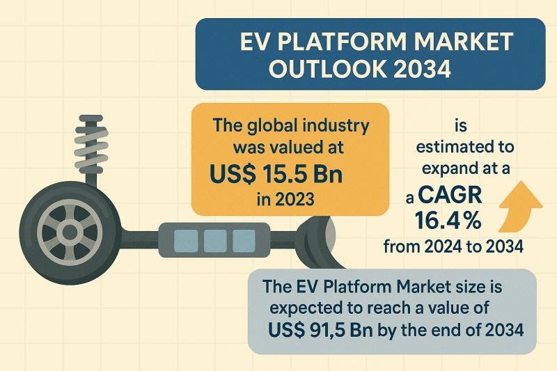 The EV platform market witnesses a rapid expansion, expected to grow from US $ 15.5 billion in 2023 to a stunning US $ 91.5 billion by 2034, with a CAGR of 16.4% during the forecast period. This wave is driven by the accelerating acceptance of electric vehicles (EVs) worldwide and the increasing shift to modular and scalable vehicle architectures.
