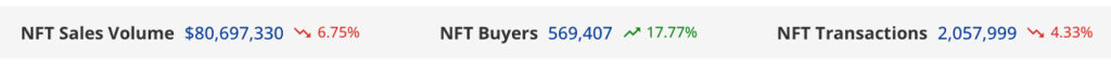 NFT sales fell 6.75% this week, as data from cryptoslam.io shows. Over the past seven days, NFT transactions have also fallen by 4.33%. Despite this drop in sales, the number of NFT buyers rose to 569,407, an increase of 17.77% compared to the previous week.