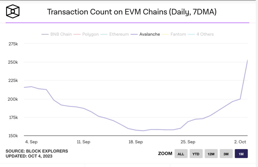 Transactions on Avalanche, meanwhile, have seen a significant increase, with figures rising from 158,000 on September 20 around the time Stars Arena launched to more than 250,000 on October 3, according to The Block’s Data Dashboard.