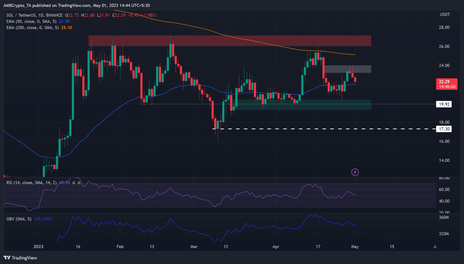 The recovery that took place at the end of April reached an FVG (fair value gap) of $23.19 – $23.98 (white), which brought bulls’ efforts to a halt. At the time of writing, sellers were eager to push SOL below the 50-EMA ($21.99) (blue line).