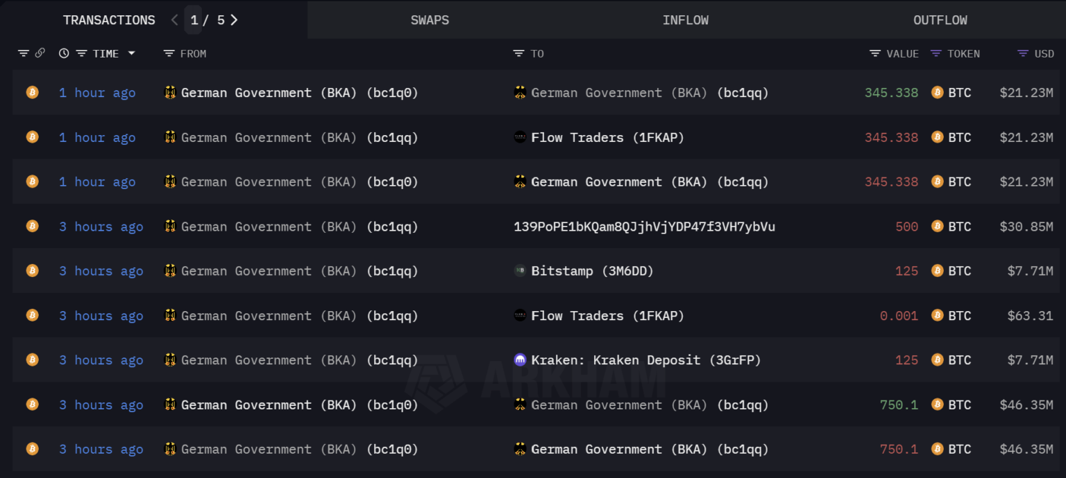 In an ongoing effort to liquidate its substantial Bitcoin holdings, the German government has once again engaged in significant transactions involving BTC, according to data from blockchain analytics platforms Arkham Intel. This morning, the Federal Criminal Police Office (BKA) carried out nine transactions involving a total of approximately 2,786 BTC.