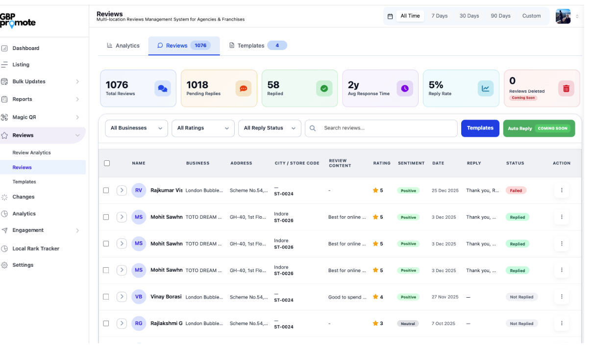 Managing multiple listings across cities or locations can quickly become messy and time-consuming. GBPPromote simplifies this with centralized control, bulk actions and clear visibility across all locations.